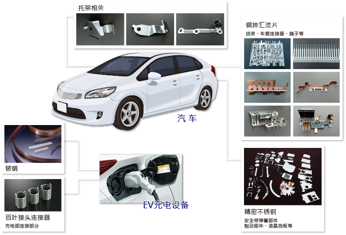 此外,本公司還在為今后有發展潛力的新能源汽車的電裝系統(線束、車載連接器端子)中所使用的不銹鋼、 鋁、銅合金和電鍍材料等方面提供廣泛的供應。利用本公司的加工基地,也可以供應母線和鑲件成形品。